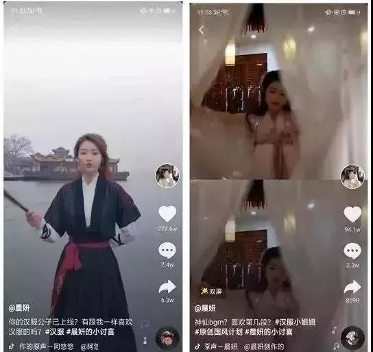 比如抖音達人-晨妍:目前有(yǒu)642萬粉絲,日銷近百萬了,接連發了很(hěn)多(duō)條和國(guó)風相關的内容,穿着漢服,配上熱門音樂,反響也都很(hěn)不錯!
