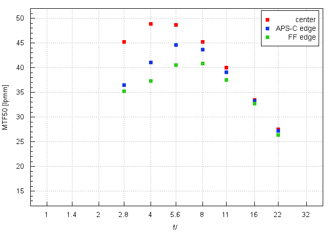 鏡頭在APS-C / DX傳感器邊緣的表現也很(hěn)不錯。在最大光圈處,MTF達到36.5 lpmm的良好水平,并且在光圈F5.6,它們超過44 lpmm。即使是10年前,這樣的結果也隻有(yǒu)最好的定焦鏡頭的中(zhōng)心部分(fēn)能(néng)夠達到。