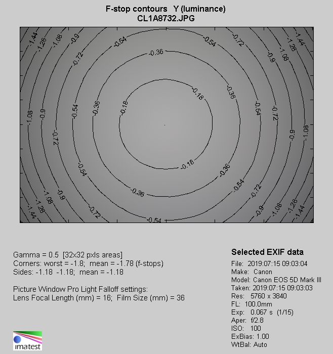 暗角量顯然較高。在光圈F2.8下,失光量大約為(wèi)46%(1.78 EV),在光圈F5.6下為(wèi)15%(0.47 EV)。到光圈F8F11,暗角幾乎不可(kě)見,分(fēn)别為(wèi)10% (0.29 EV)5% (0.16 EV)