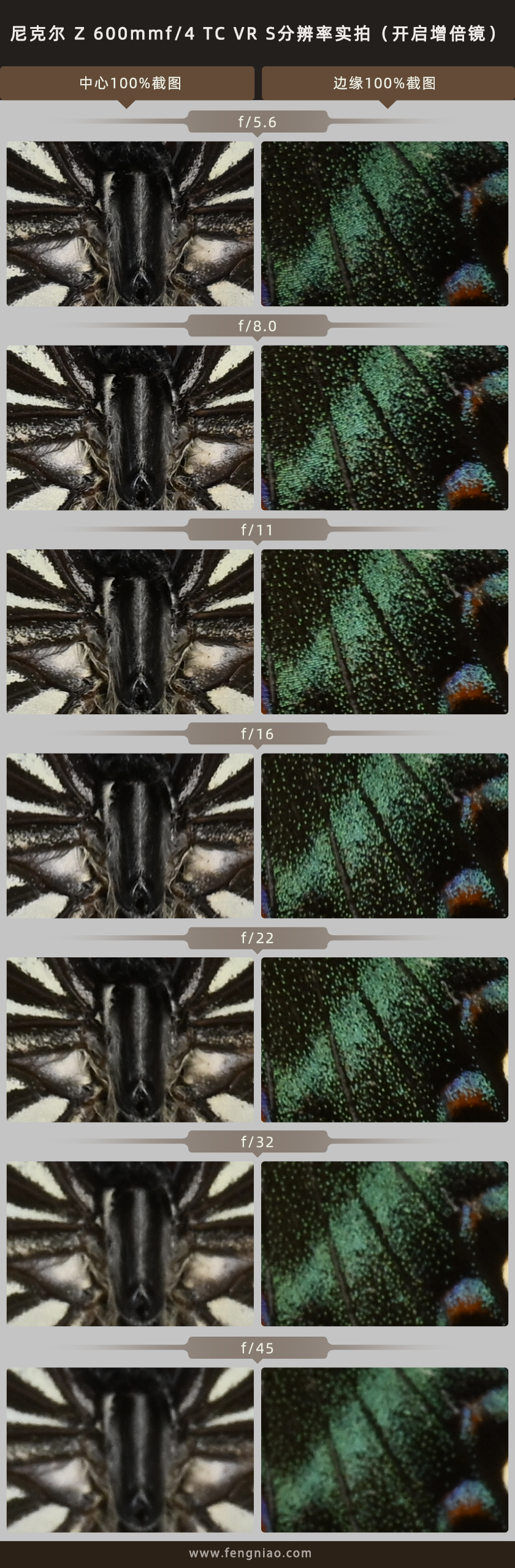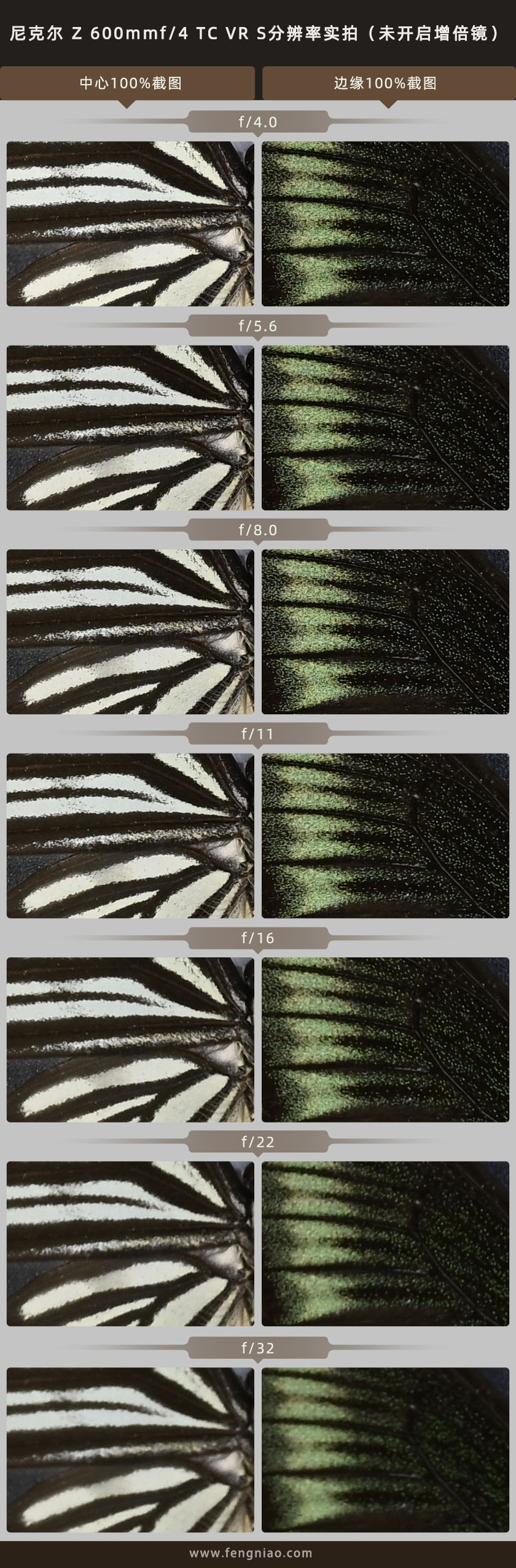 在分(fēn)辨率測試環節中(zhōng),我們來看看尼克爾 Z 600mm f/4 TC VR S的分(fēn)辨率表現,我采用(yòng)的機身是尼康Z 9、三腳架固定、關閉機身防抖、固定ISO 100、逐級調整光圈,RAW+JPEG雙格式記錄,分(fēn)别對拍攝畫面的中(zhōng)心和邊緣位置進行100%截圖觀察,首先來看看沒有(yǒu)開啓1.4倍增倍鏡的分(fēn)辨率表現。