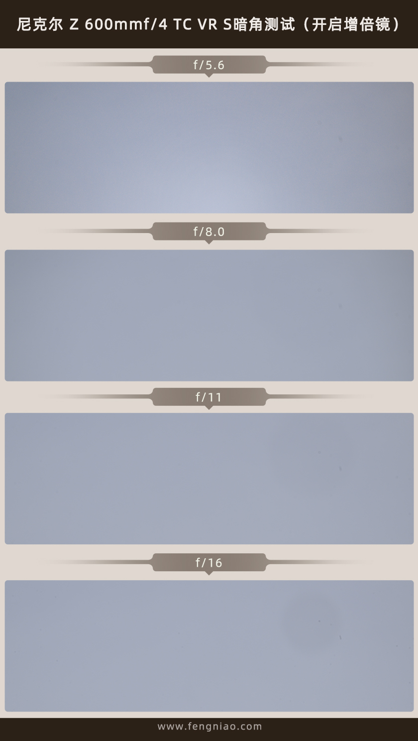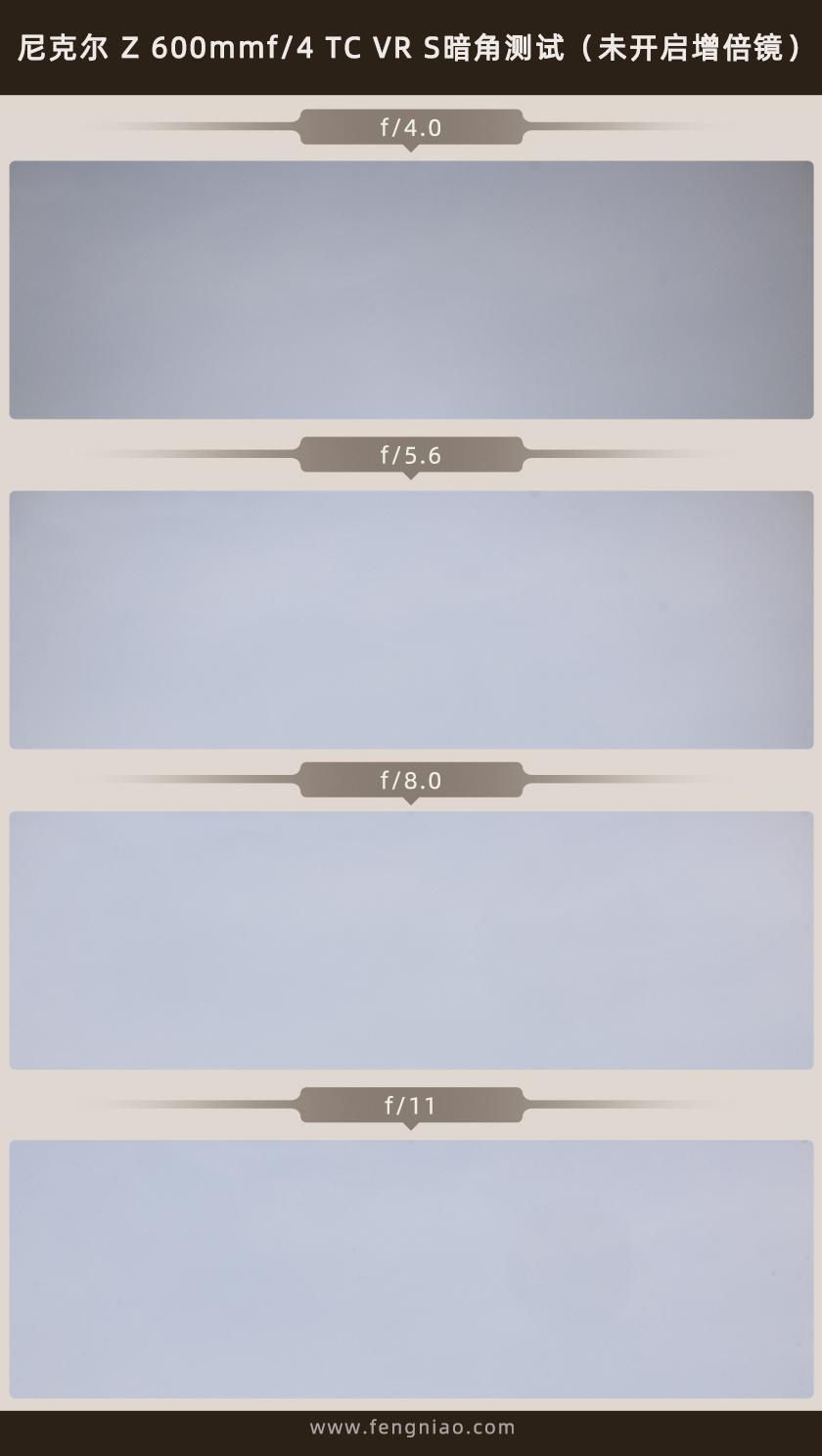 由于這支尼克爾 Z 600mm f/4 TC VR S是自帶1.4倍增倍鏡的,所以在暗角測試方面,我分(fēn)别開啓以及關閉增倍鏡來進行拍攝,通過實際拍攝可(kě)以發現,在未開啓增倍鏡的情況下,這支鏡頭存在非常輕微的暗角現象,而在開啓增倍鏡之後,最大光圈變成了f/5.6,實際拍攝可(kě)以發現其同樣也存在非常輕微的暗角現象,這樣的表現對于拍攝的時候無傷大雅,實際對畫質(zhì)并沒有(yǒu)什麽影響。